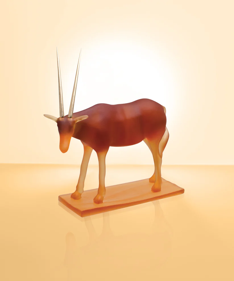 Cet Oryx Daum, réalisé en collaboration avec l’artiste Hicham Lahlou et inspiré par la majesté de l’oryx, capture l’essence même de cet animal sauvage. Façonnée à la main en pâte de verre ambre, technique séculaire maîtrisée par Daum, cette œuvre dévoile un savoir-faire ancestral, à travers les détails délicats et le rendu visuel saisissant. Les nuances de couleur, du doré au brun, évoquent les paysages désertiques, habitat naturel de l’oryx. Chaque pièce est une véritable prouesse technique, alliant maîtrise artisanale et esthétique raffinée. L’oryx, figé dans son élan, devient une présence magnétique dans votre espace, invitant à la contemplation et au respect de la nature sauvage. Création unique de la prestigieuse cristallerie Daum. Édition limitée à 375 exemplaires.