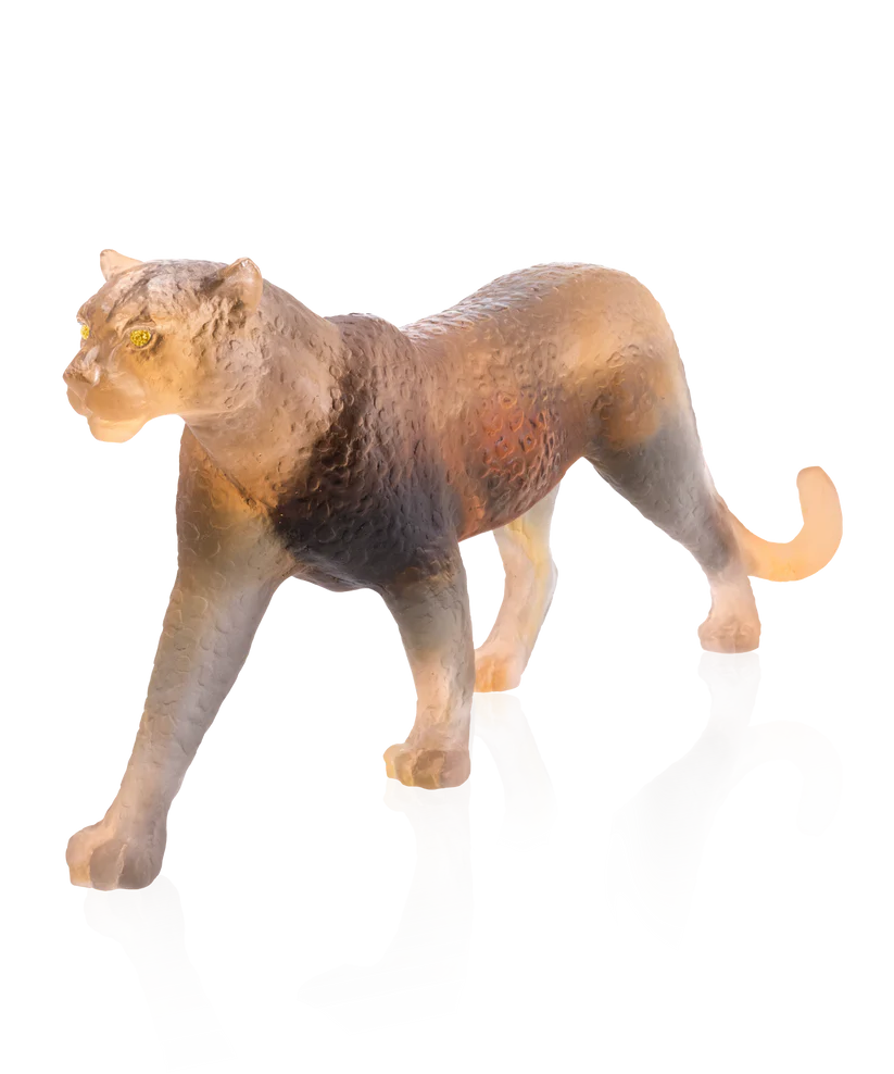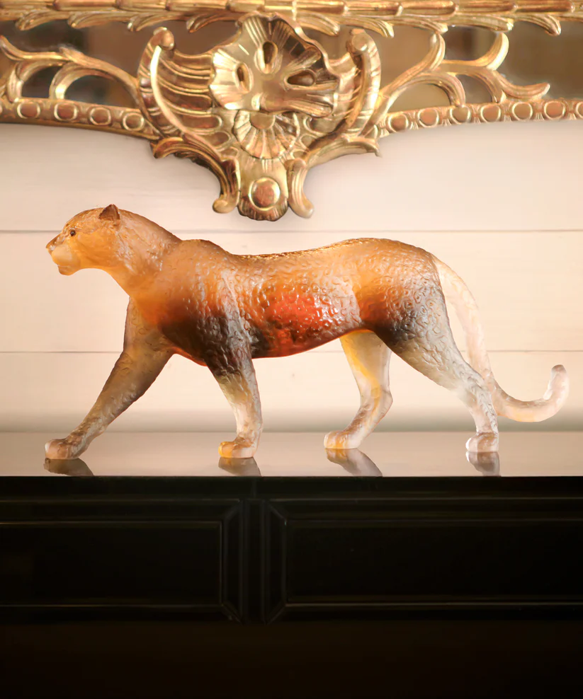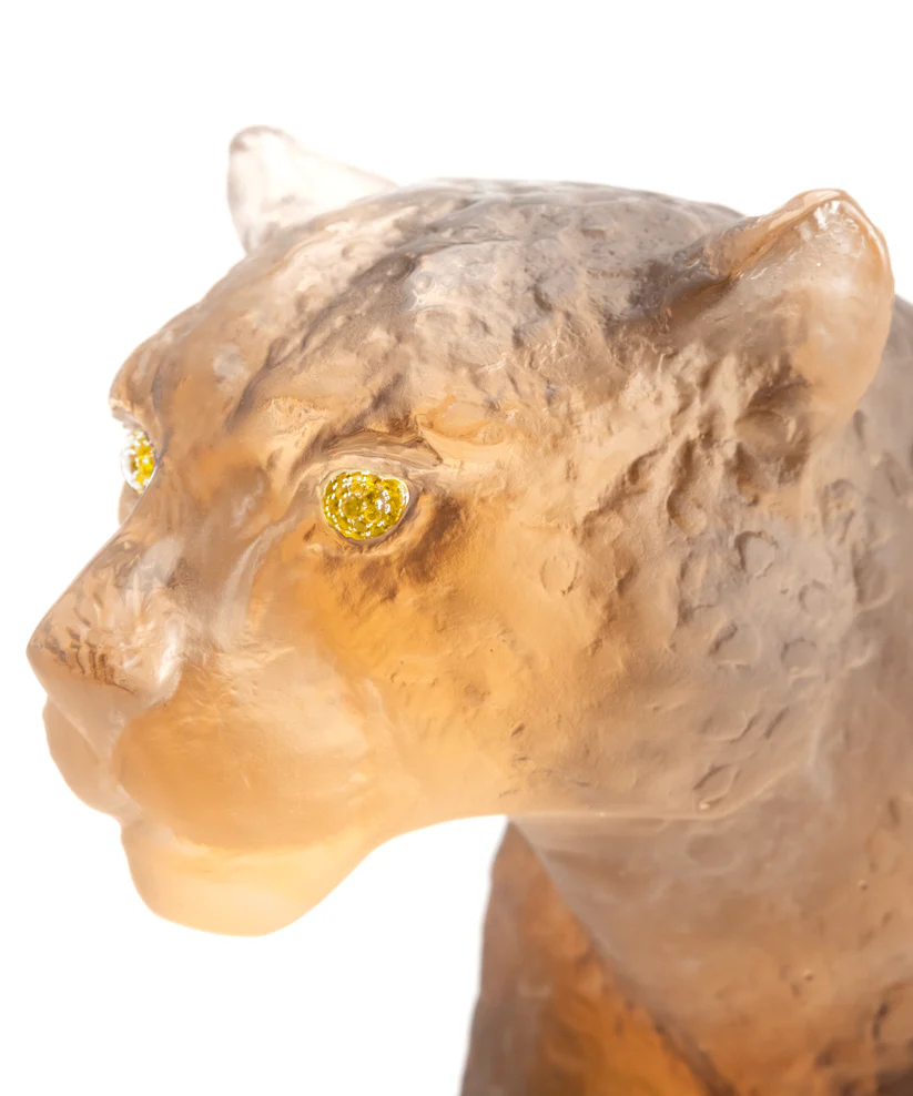 Cette sculpture Daum d’une panthère aux yeux sertis de véritables citrines, limitée à 50 exemplaires dans le monde, évoque la grâce sculptée dans la pâte de verre. Façonnée avec soin en pâte de verre, technique séculaire maîtrisée par Daum, elle révèle une énergie captivante et la lumière qui caresse la matière. Ses jeux de lumière et de transparence subliment l’élégance naturelle, créant une aura fascinante. Chaque détail témoigne d’un savoir-faire d’exception et d’une passion pour la création. Une œuvre poétique et intemporelle signée, où l’art et la nature s’unissent. Signature de la prestigieuse cristallerie Daum depuis 1878. Édition limitée à 50 exemplaires.