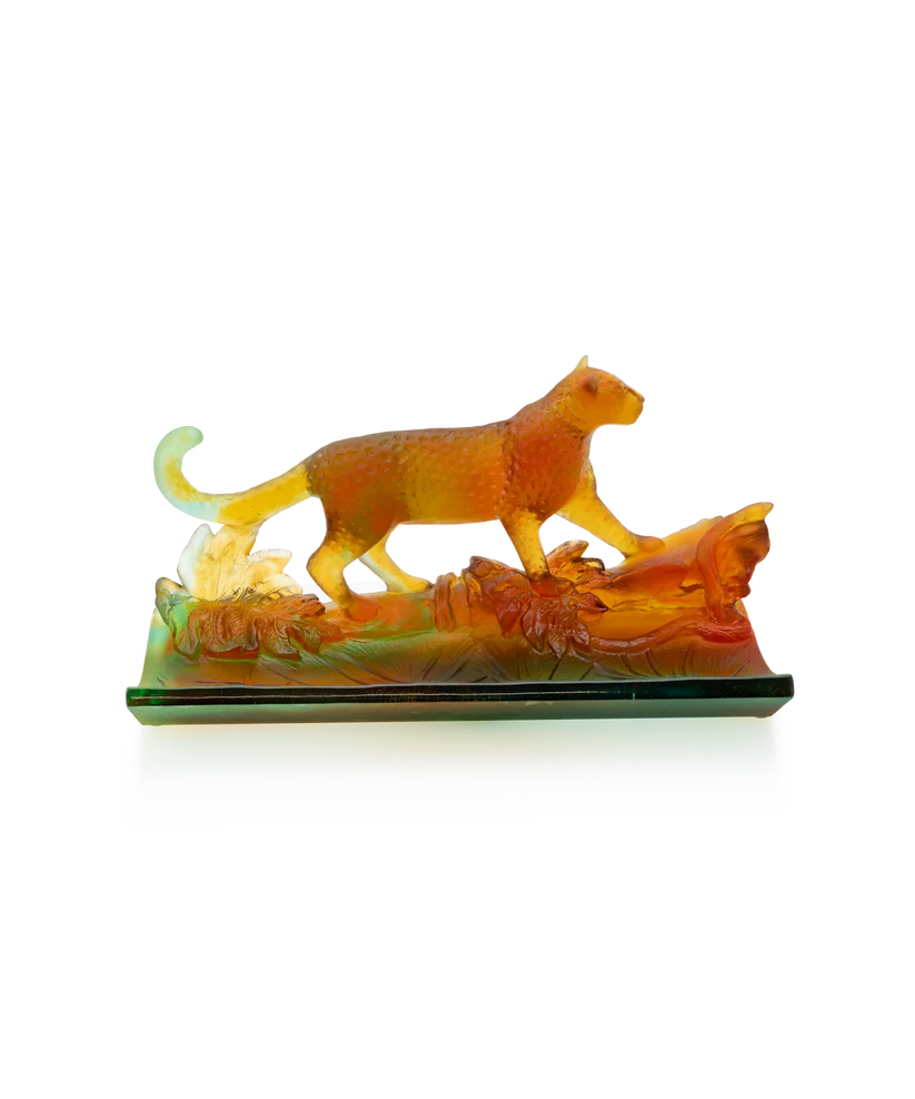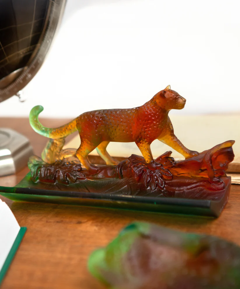 Ce plumier Daum, issu de la collection Léopard Tropical et inspiré par la majesté de la faune tropicale, évoque la présence magnétique du léopard. Façonné en pâte de verre ambre & verte, technique séculaire maîtrisée par Daum, il capture l’éclat de la lumière, révélant des nuances de couleurs sublimes. La maîtrise artisanale de Daum donne vie à cette œuvre d’art, où chaque détail du léopard est soigneusement travaillé, créant un mouvement éternel. Cette sculpture, délicatement posée sur votre bureau ou dans votre salon, invite à la contemplation, apportant une touche d’élégance et de mystère à votre espace. Création unique de la prestigieuse cristallerie Daum. Édition numérotée.