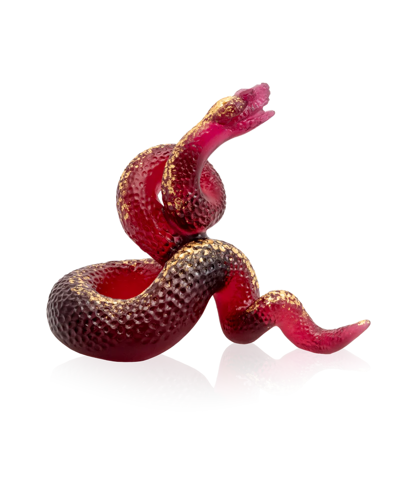 Ce Serpent Rouge Daum, limité à 88 exemplaires dans le monde, évoque une énergie captivante. Façonné en pâte de verre, technique séculaire maîtrisée par Daum, il révèle la lumière qui caresse la matière et la noblesse du mouvement. Ses jeux de lumière et de transparence subliment une présence magnétique, créant une aura fascinante. Chaque détail témoigne d’un savoir-faire d’exception et d’une passion pour la création. Une œuvre poétique et intemporelle signée Daum, où l’art et la nature s’unissent. Rehaussé d’une délicate finition à l’or appliquée à la main, il révèle un éclat précieux qui magnifie ses courbes et souligne la richesse de son expression. Création unique de la prestigieuse cristallerie Daum. Édition limitée à 88 exemplaires.