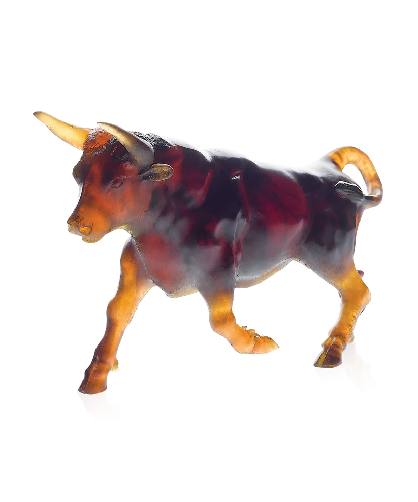 Ce Taureau Daum, émergeant d’un rêve éthéré, rappelle la force brute et la majesté de la nature. Façonnée à la main en pâte de verre, technique séculaire maîtrisée par Daum, cette sculpture offre une expression saisissante. Les nuances non précisées de son cristal captent et réfractent la lumière, créant un spectacle visuel de transparences colorées. Sa présence magnétique transforme chaque espace, invitant les spectateurs à s’arrêter et à contempler sa beauté, comme si le mouvement éternel de la vie était figé dans le cristal vivant. Création unique de la prestigieuse cristallerie Daum.