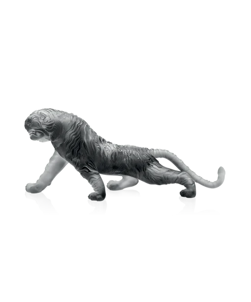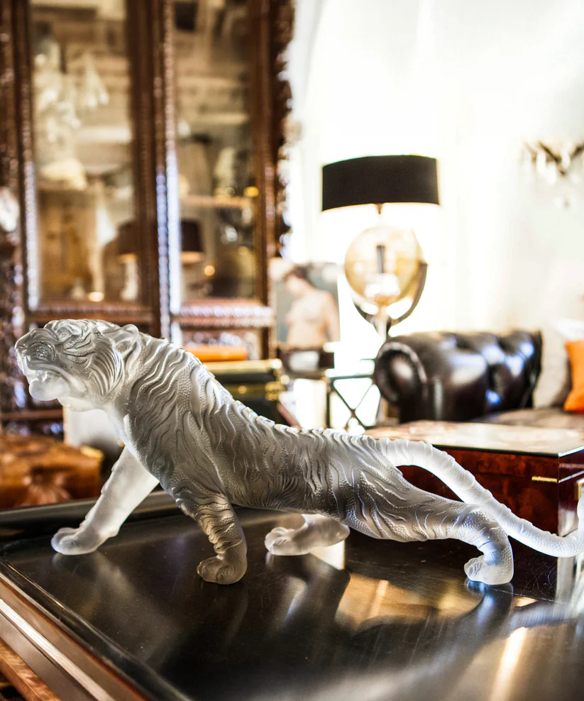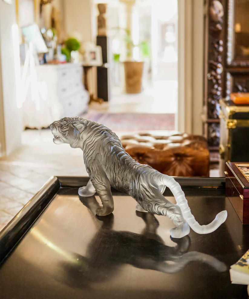 Cette sculpture Daum, évoquant la puissance et la grâce du Tigre du Bengale, est une ode à la beauté sauvage de la nature. Façonnée en pâte de verre, technique séculaire maîtrisée par Daum, cette maîtrise artisanale exceptionnelle donne vie à cette créature, capturant chaque détail avec une précision et une délicatesse remarquables. Les nuances grisées du cristal reflètent des éclats de lumière, conférant à l’ensemble une présence magnétique. Cette sculpture, aux proportions généreuses, apporte une touche d’élégance et de mystère à votre espace, invitant à la contemplation de la beauté naturelle et de l’art verrier. Subtile rappel de l’excellence de la prestigieuse cristallerie Daum depuis 1878. Édition limitée à 88 exemplaires.