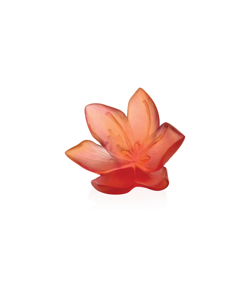 Cette fleur décorative Daum de la collection Safran, évoquant l’exotisme des champs de safran, insuffle un vent de passion. Façonnée en pâte de verre, technique séculaire maîtrisée par Daum, des nuances ardentes d’orange et de rouge prennent vie, capturant la lumière naturelle dans un ballet d’éclats vibrants. Son format généreux et ses couleurs chaleureuses en font une véritable sculpture lumineuse, une invitation à contempler la beauté de l’instant et à célébrer la maîtrise artisanale. Création unique de la prestigieuse cristallerie Daum.