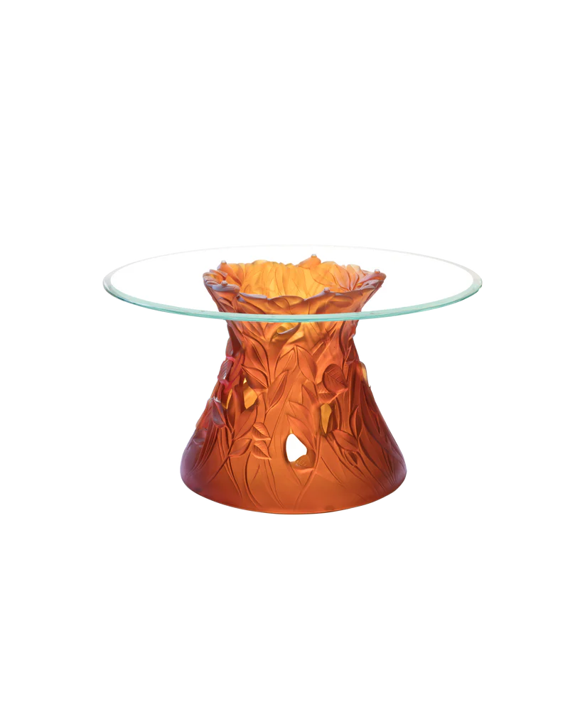 • Table Basse Végétale Daum en pâte de verre. Couleur ambre, avec un plateau en verre trempé. Édition numérotée.