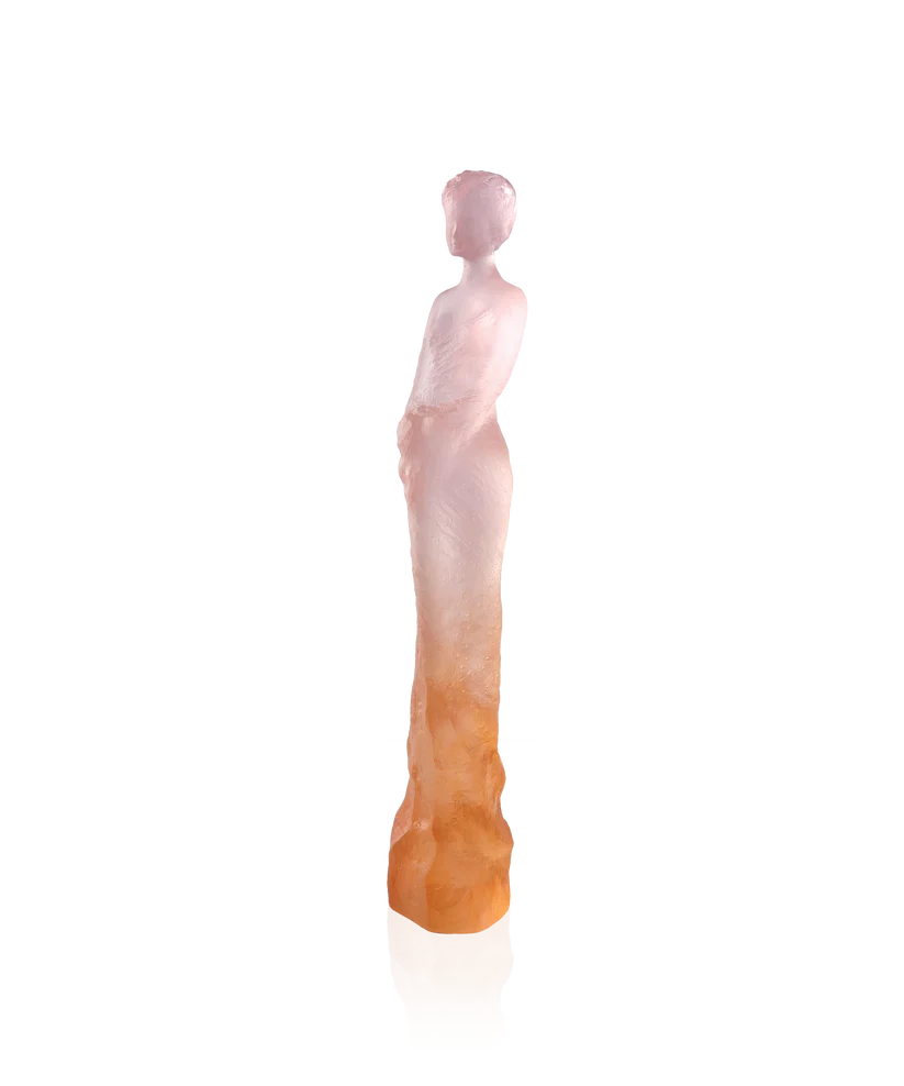« Eugénie » de Daum en rose jaune, réalisée en collaboration avec l’artiste Jean-Philippe Richard et inspirée par la délicatesse des jardins en fleurs, est une célébration de la féminité. Façonnée en pâte de verre, technique séculaire maîtrisée par Daum, donnant vie à une figure féminine élancée, dont les transparences colorées captent les éclats de lumière. Les nuances florales qui dansent sur sa surface sont un hommage à la nature et à sa beauté éphémère. Placée dans votre espace, « Eugénie » invite à la contemplation et à la découverte de l’émotion captée dans son mouvement éternel. Création unique de la prestigieuse cristallerie Daum. Édition limitée à 375 exemplaires.