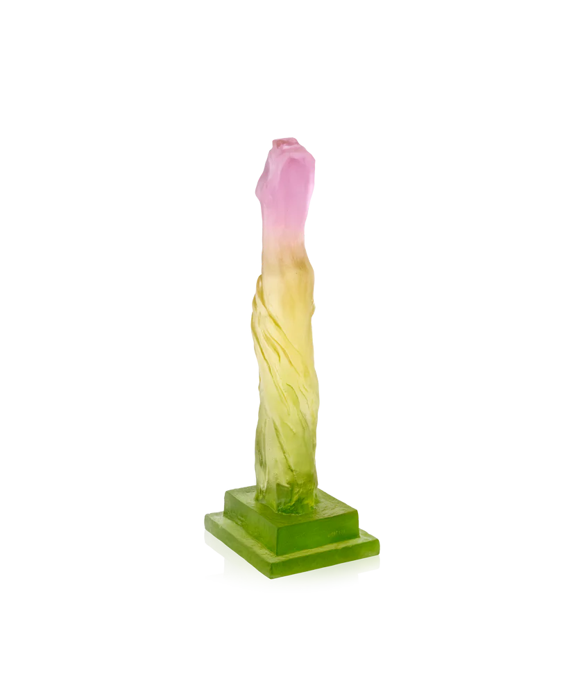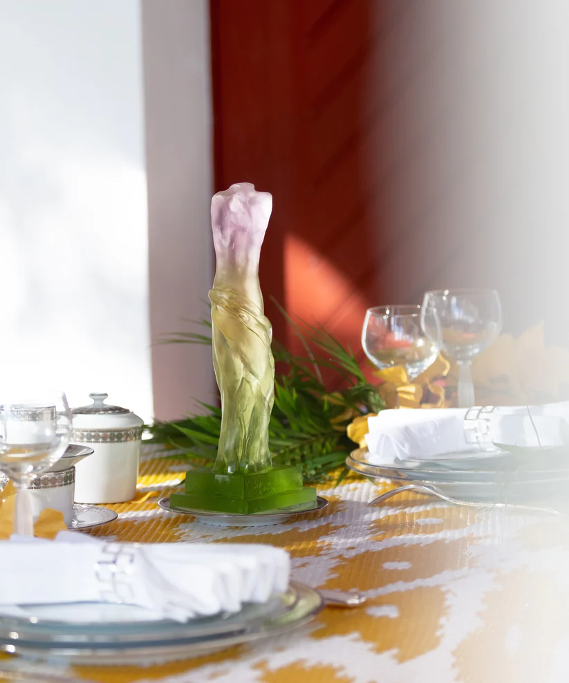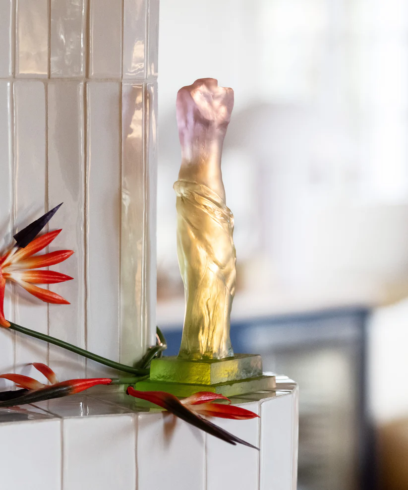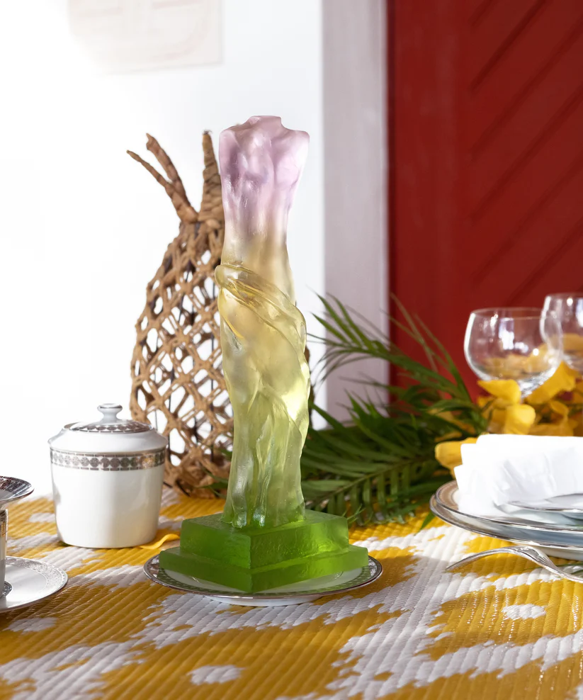 La sculpture « Vénus » de Daum, réalisée en collaboration avec l’artiste Laurence Bonnel et inspirée par la déesse de l’amour et de la beauté, est une ode à la féminité. Façonnée en pâte de verre, technique séculaire maîtrisée par Daum, les courbes délicates et le mouvement figé de la statuette capturent l’essence même de l’élégance féminine, tout en évoquant une présence magnétique. La transparence du cristal joue avec les éclats de lumière, donnant vie à l’œuvre. Cette sculpture ajoutera une touche de raffinement et d’art à votre espace, invitant à la contemplation et à l’admiration de la maîtrise artisanale unique de la prestigieuse cristallerie Daum. Édition limitée à 175 exemplaires.