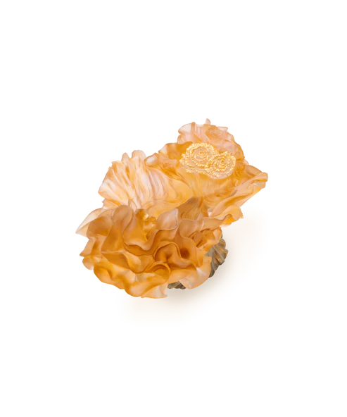 • Centre de table Rose Royale Daum en pâte de verre. Modèle Prestige, avec une finition à la feuille d’or sur un bouquet de deux roses. Édition limitée à 99 exemplaires.