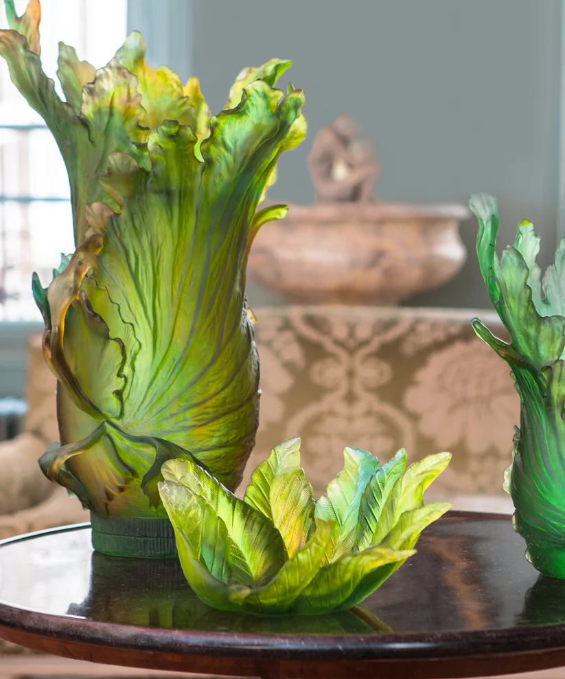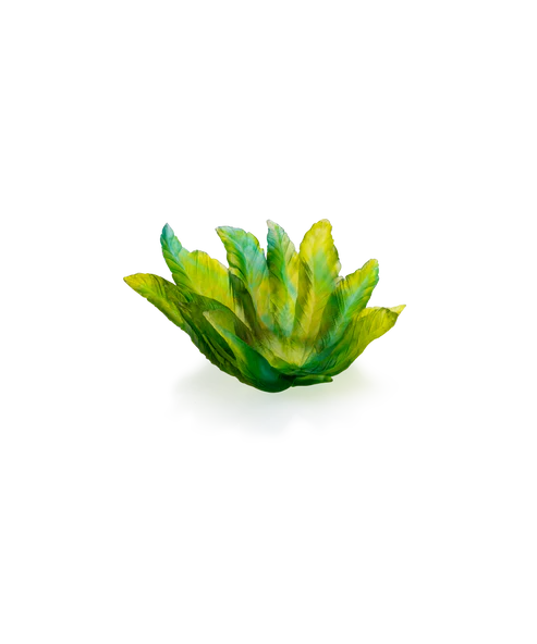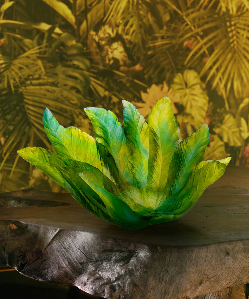 Cette coupe Daum en cristal vert, issue de la collection Bornéo réalisée en collaboration avec l’artiste Emilio Robba et inspirée de la nature luxuriante de Bornéo, captive le regard. Façonnée en pâte de verre, technique séculaire maîtrisée par les artisans Daum, des transparences nuancées et des éclats de lumière qui semblent danser à la surface de la coupe se créent. Les formes fluides de l’objet créent une interaction poétique avec la lumière, comme si chaque courbe retenait un fragment de la forêt vierge. Que la coupe soit vide ou qu’elle serve à sublimer une composition florale, elle est une invitation à la contemplation et apporte une touche d’élégance et de beauté naturelle à tout espace. Création unique de la prestigieuse cristallerie Daum. Édition limitée à 375 exemplaires.