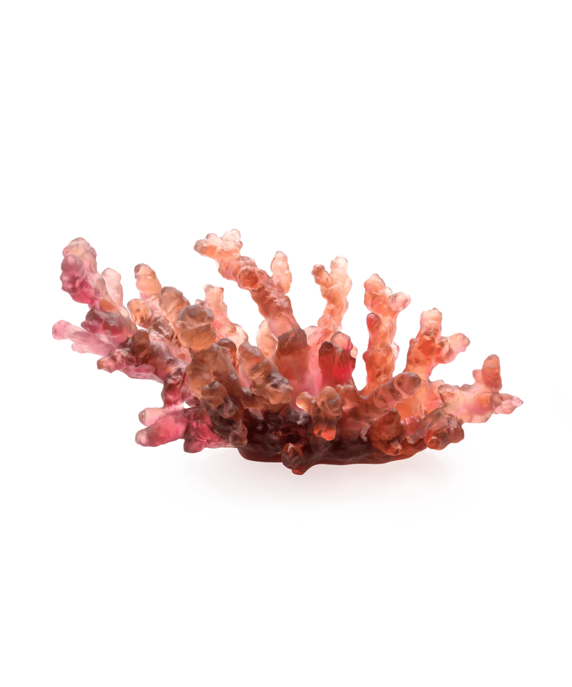 Cette coupe Daum, issue de la collection Mer de Corail et inspirée par la vivacité du monde sous-marin, évoque la beauté enchantée de la Mer de Corail. Façonnée en pâte de verre, technique séculaire maîtrisée par Daum, elle est métamorphosée en une sculpture de cristal vivant, où les transparences colorées de rouge aurore se mêlent en un mouvement éternel. Le savoir-faire artisanal sublime l’expression saisissante de la nature, transformant la lumière en un spectacle magnétique. Cette coupe, aux dimensions généreuses, apporte une présence lumineuse dans tout espace, invitant à une contemplation de la merveilleuse danse de la lumière naturelle. Création unique de la prestigieuse cristallerie Daum. Édition numérotée.