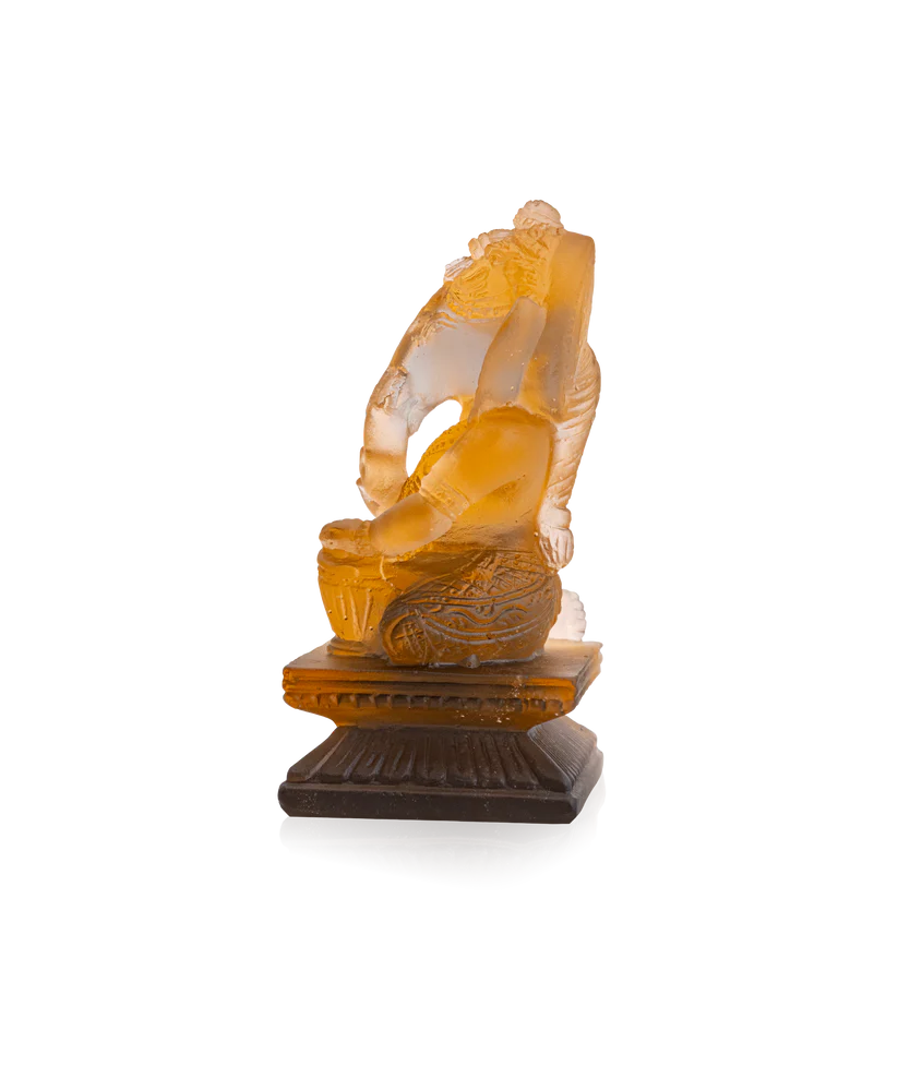 Ce « Ganesh Musicien Tabla » de Daum, inspiré de la divinité hindoue, évoque la sérénité des temples anciens et la mélodie de la nature. Façonnée en pâte de verre, technique séculaire maîtrisée par Daum, chaque détail de cette sculpture est soigneusement travaillé dans la pâte de verre, donnant vie à Ganesh, le musicien ambre. Les couleurs non précisées, comme les notes d’une partition, créent une symphonie visuelle, où l’éclat du cristal capture la lumière naturelle. Cette œuvre délicate invite à la contemplation, transportant l’esprit vers des horizons lointains et exotiques, en apportant une touche d’élégance et de mystère à votre espace. Création unique de la prestigieuse cristallerie Daum.