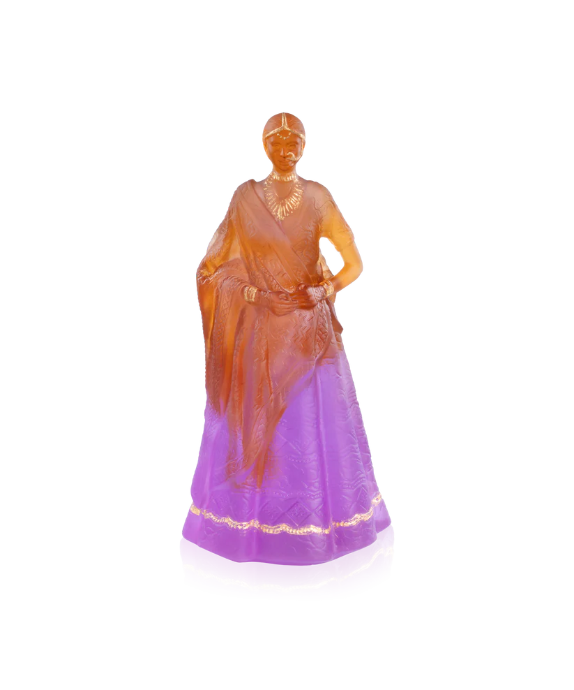 Cette Rani Padmini Daum, réalisée en collaboration avec l’artiste Paul Beckrich et limitée à 25 exemplaires dans le monde, évoque une légende de lumière et de courage : souveraine intemporelle, elle s’élève dans un éclat somptueux de tradition et de grâce. Majestueuse, elle semble respirer la ferveur des palais du Rajasthan et murmurer l’héritage d’une histoire où force et beauté ne font qu’un. Façonnée en pâte de verre, technique séculaire maîtrisée par Daum, ses drapés flamboyants, aux nuances d’ambre et de rose fuchsia, vibrent comme une flamme sacrée ; ses ornements dorés scintillent tels des joyaux précieux, célébrant la noblesse d’une reine dont la dignité traverse les siècles. Modelée en pâte de cristal Daum selon le savoir‑faire incomparable de la cristallerie française, elle magnifie le Verre Daum par des jeux exquis de lumière et de transparence. Chaque détail, du pli du sari à la pureté de son expression, témoigne de l’excellence des ateliers de Daum Nancy, où la matière s’anime pour révéler des émotions sculptées. La signature Daum scelle cette œuvre comme un sceau d’art et d’héritage : Rani Padmini n’est plus seulement une figure de légende, elle devient une sculpture lumineuse et intemporelle, pont entre histoire et création contemporaine. Création unique de la prestigieuse cristallerie Daum. Édition limitée à 25 exemplaires.