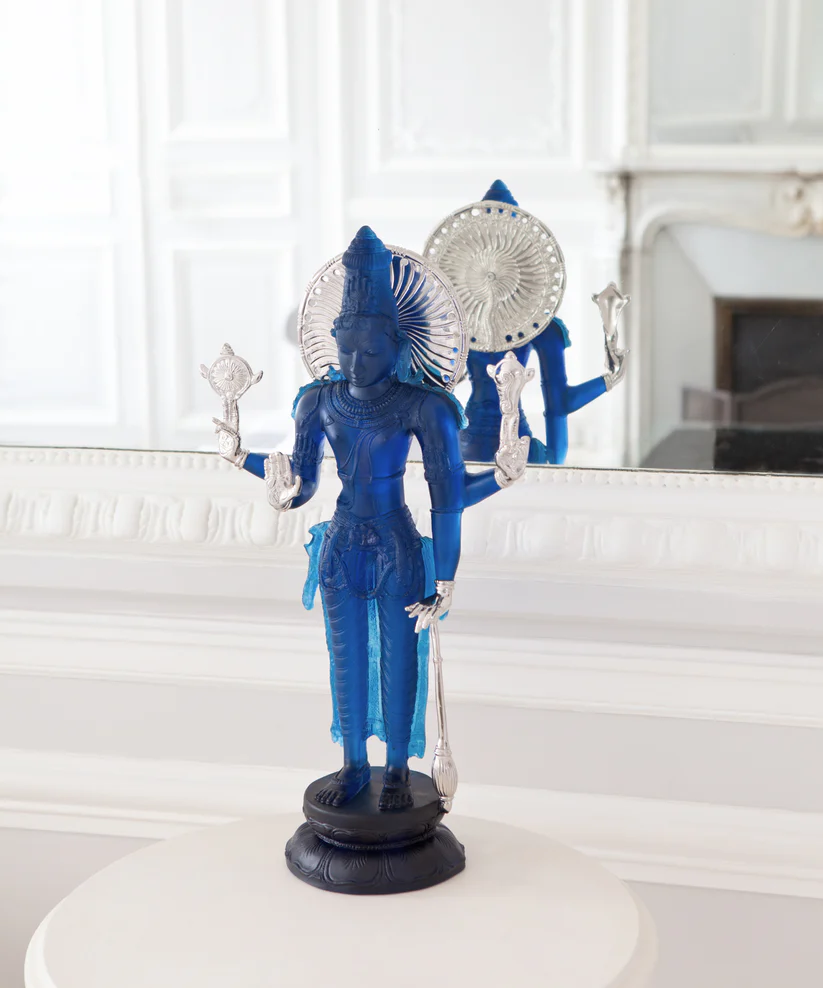 Cette « Vishnu XL » de Daum, inspirée de la divinité hindoue, évoque la sérénité et la puissance divines. Façonnée en pâte de verre, technique séculaire maîtrisée par Daum, démontrant le mouvement éternel capturé dans le cristal, l’expression saisissante de Vishnu et la technique d’artisanat raffinée. Les nuances subtiles et la transparence du cristal captent et reflètent la lumière, donnant vie à la sculpture. Cette pièce imposante apporte une présence divine à votre espace, invitant à la contemplation de la beauté et de l’artisanat d’exception de la prestigieuse cristallerie Daum. Édition limitée à 88 exemplaires.