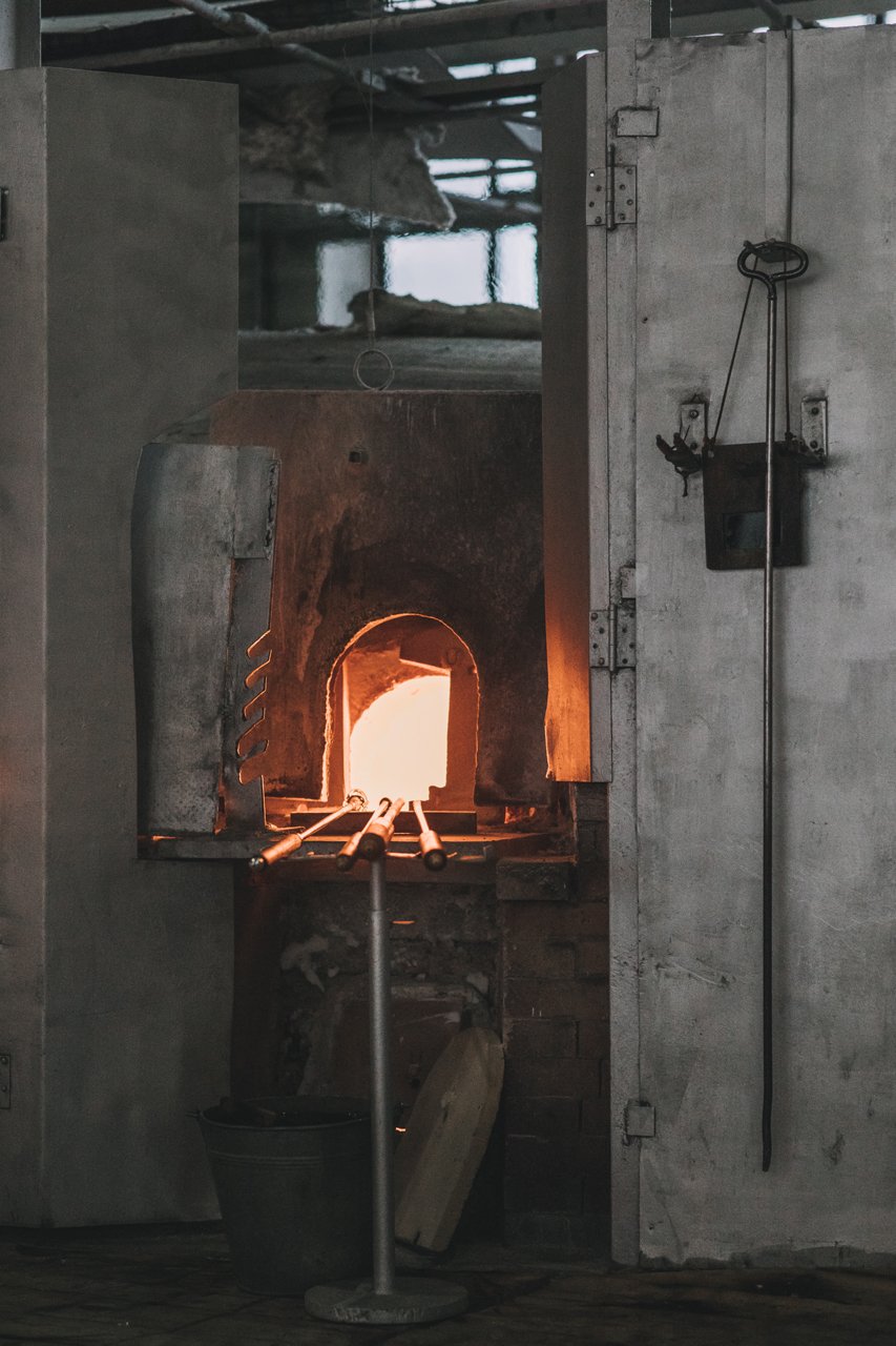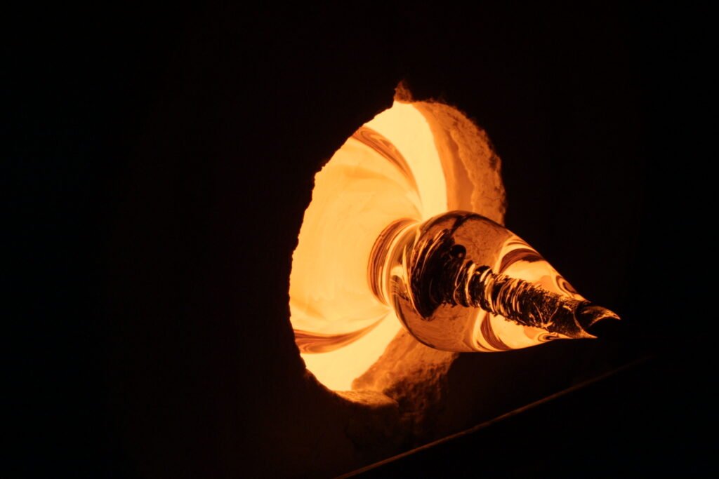 Suite à la fusion du mélange, le travail à chaud peut commencer. Et alors débute une course contre la montre afin de travailler le cristal avant qu’il ne se durcisse et devienne inutilisable.