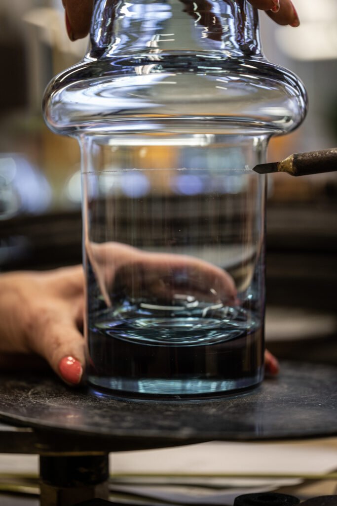 À cette étape, le haut de la pièce est encore attaché à sa canne. C’est à ce moment-là que le verrier procède à une mise en pontil :
