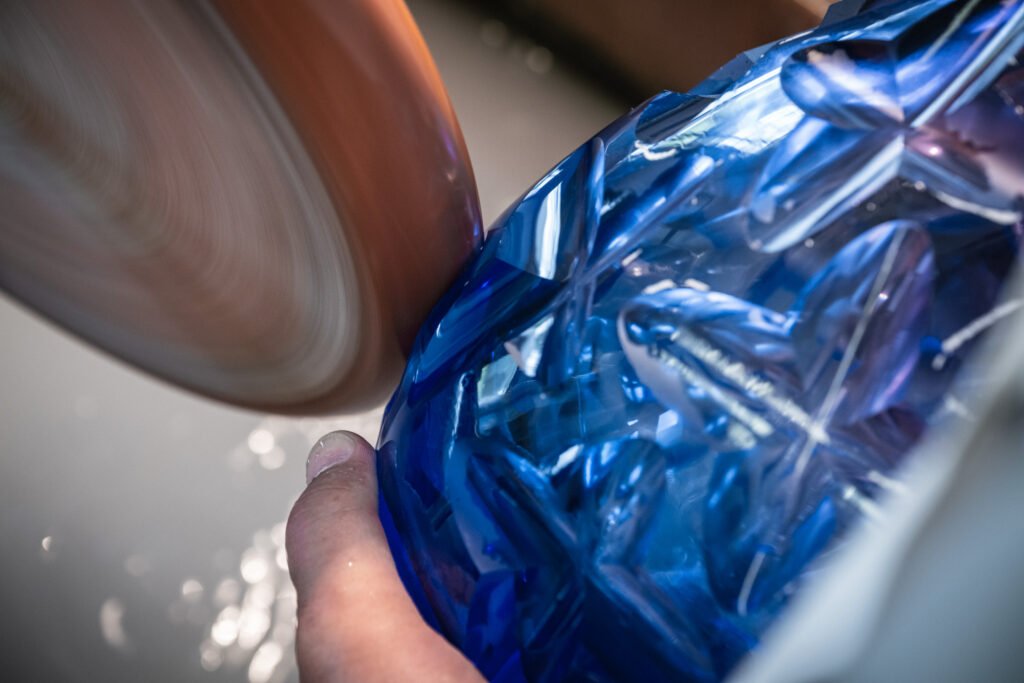 En fonction des pièces, toutes les étapes qui suivent ne sont pas nécessaires. Une pièce en cristal lisse n’aura, par exemple, pas besoin de l’étape de la taille, de la gravure ou des finitions.